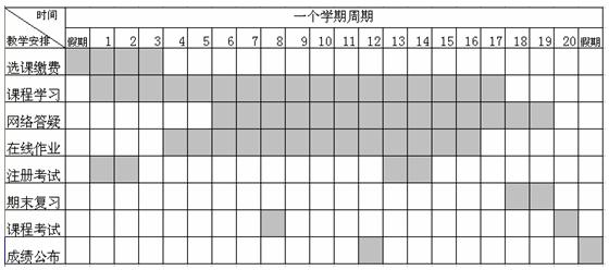 说明: 1、 上图为教学工作的总体安排,以一学期学习时间为例,每年两个学期周而复始,各工作周期相对稳定。 2、 每年只安排两次选课缴费,学生在制定自己的学习计划时,既要考虑利用好每次的选课机会,也要考虑自己的学习能力及考试的时间。选课时,应注意参考《课程考试计划》,合理安排自己的学习进度。 3、 学生在第一次选课缴费后可以参加课程学习,学生毕业时或达到学校规定的最长学习期限时,课程关闭。 4、 每学期课程开始学习后可参加本门课程每月一次网络答疑,由主讲教师解答学生学习过程中遇到的问题,直至考试结束。 5、 根据学习进展情况分三个阶段进行在线作业,平均成绩作为学生作业成绩。 6、 学生考试前一个半月进行注册考试,是指学生在考前针对自身学习情况等选择要考试的课程,并进行考试的预约,学校据此做出该生的考试安排,注册考试时间截止后不能补注册。在我院的教学管理中,注册考试是考试的前提条件,学生只有按时完成了某门课程的注册考试,才能参加该门课程的考试。 7、 每学期定期向各校外学习中心发放教学光盘。 8、 每学期两次考试。 |